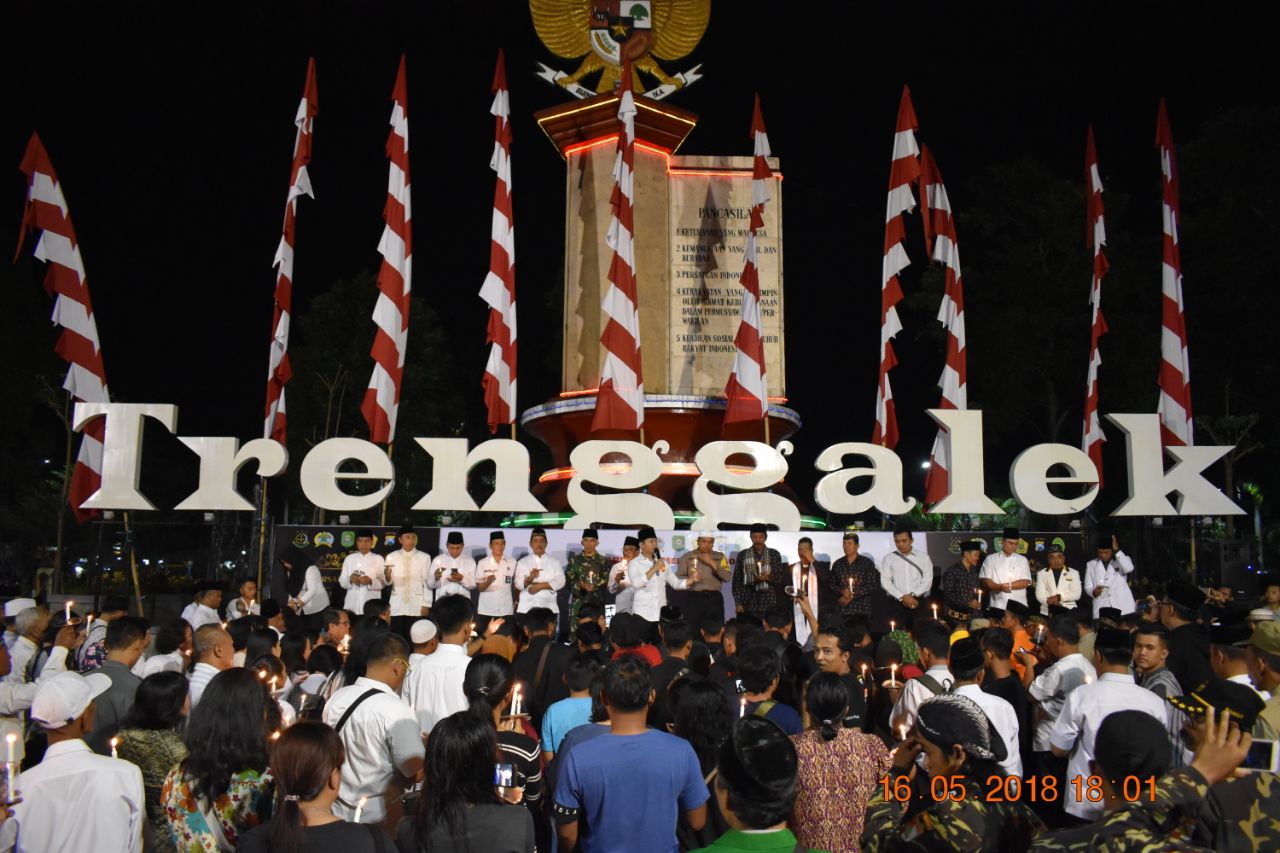 DISKOMINFO - TRENGGALEK, Melihat berbagai tragedi terorisme yang terjadi di beberapa daerah di Indonesia, Trenggalek tidak tinggal diam. Aksi doa bersama dan solidaritas kemanusiaan di Tugu Pancasila alun-alun Trenggalek sengaja digelar oleh Plt.Bupati beserta segenap Forkopimda dan perwakilan tokoh agama sebagai aksi solidaritas kepada korban atas kejadian terorisme yang terjadi di Surabaya maupun daerah lain, Rabu (16/5).Terlihat hadir pada aksi tersebut Plt.Bupati Trenggalek H.Moch Nur Arifin, Plt.Sekda Trenggalek, Ketua DPRD Trenggalek, Kapolres Trenggalek, Dandim 0806, Ka BNN Trenggalek, dan juga segenap perwakilan dari tokoh lintas agama yang ada di Kabupaten Trenggalek dan masyarakat umum lainnya.