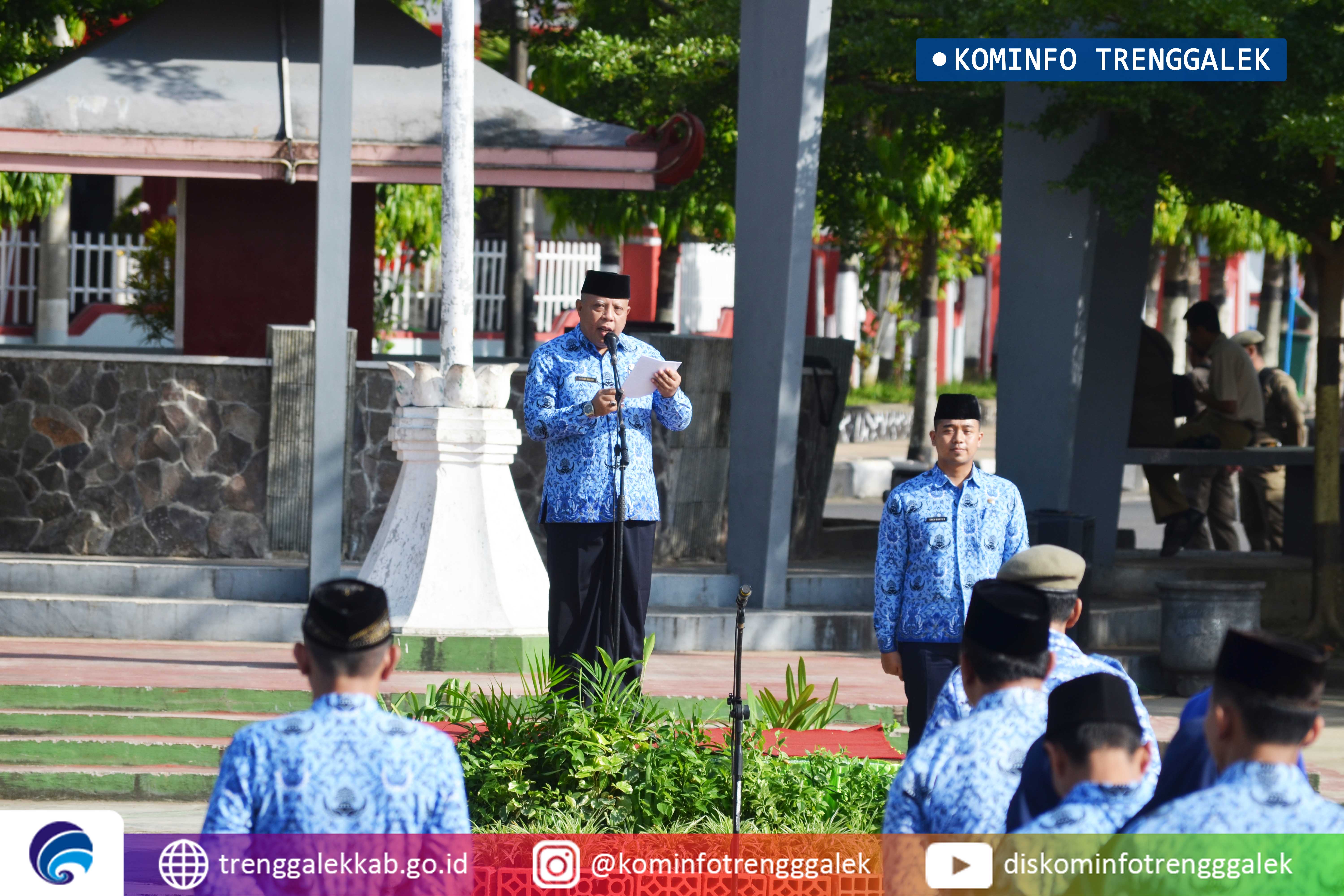 KOMINFO TRENGGALEK, Hari Bela Negara dan Hari Kesetiakawanan Sosial Nasional diperingati Pemerintah Kabupaten Trenggalek dengan menggelar upacara di Alun-alun Trenggalek. Segenap Aparatur Sipil Negara lingkup Pemkab Trenggalek nampak khidmat mengikuti jalannya upacara yang dipimpin oleh Inspektur Upacara, Asisten I Sekda Trenggalek Sugeng Widodo, SH, Rabu (19/12).