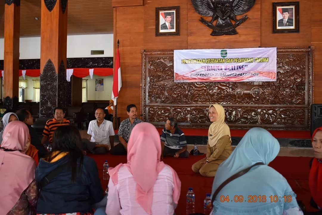 KOMINFO TRENGGALEK, Pasca  kebakaran yang terjadi di Pasar Pon, Pemkab Trenggalek berikan trauma healing atau terapi pemulihan pasca trauma bagi pedagang Pasar Pon yang menjadi korban kebakaran, Selasa (4/9).  Trauma healing dilaksanakan oleh Dinsos P3A di Pendhapa Manggala Praja Nugraha Trenggalek dengan menggandeng dokter dari RSUD dr.Soedomo Trenggalek dan beberapa pakar trauma healing.