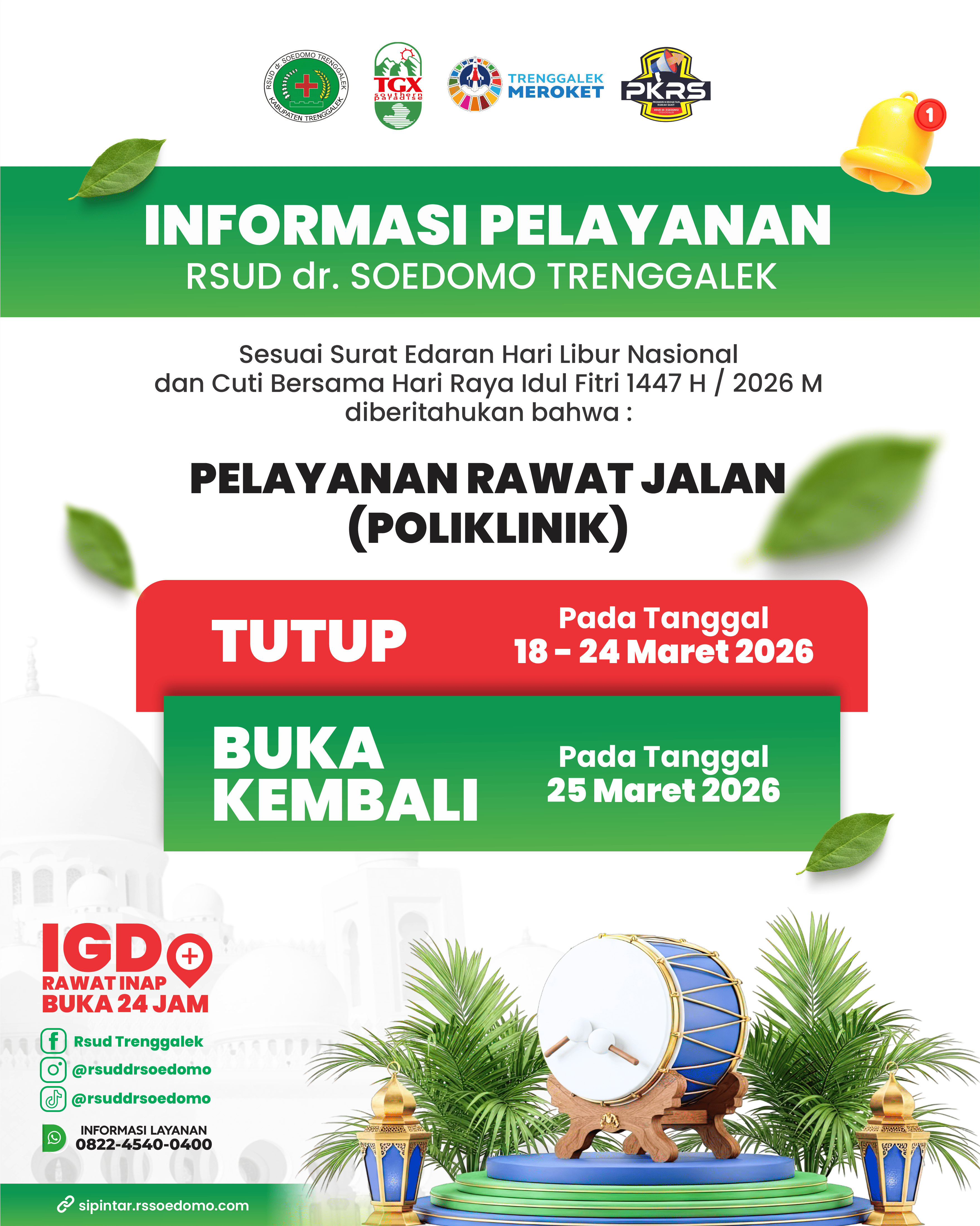 Informasi Pelayanan Poliklinik Rawat Jalan RSUD dr. Soedomo Tutup pada tanggal 18 Maret 2026 dan buka kembali pada tanggal 25 Maret 2026