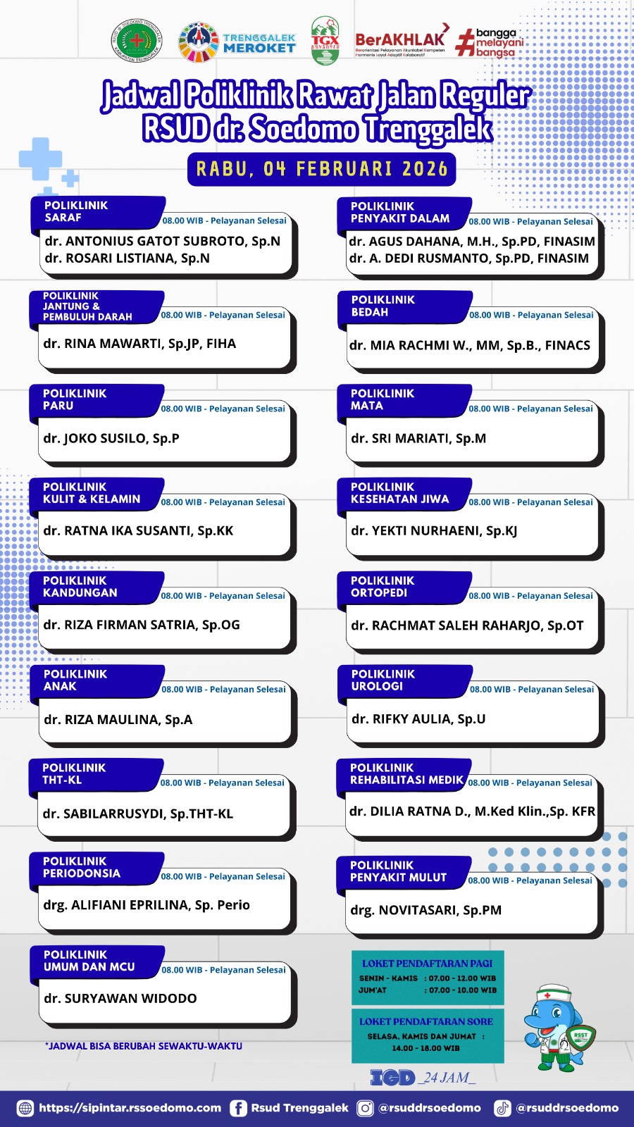 PENGUMUMAN POLIKLINIK RAWAT JALAN RSUD dr. SOEDOMO TRENGGALEK TANGGAL 4 FEBRUARI 2026
