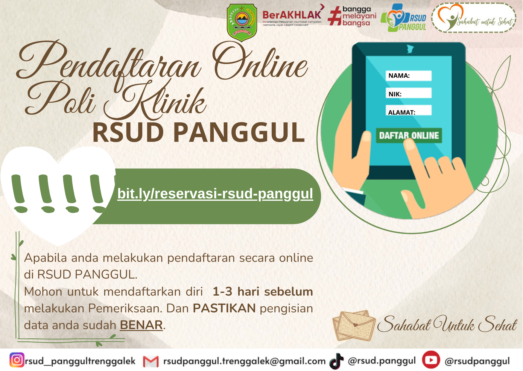 Jika anda ingin mendaftarkan secara online untuk melakukan pemeriksaan kesehatan di Poli Klinik RSUD PANGGUL. Klik link berikut: https://bit.ly/reservasi-rsud-panggul